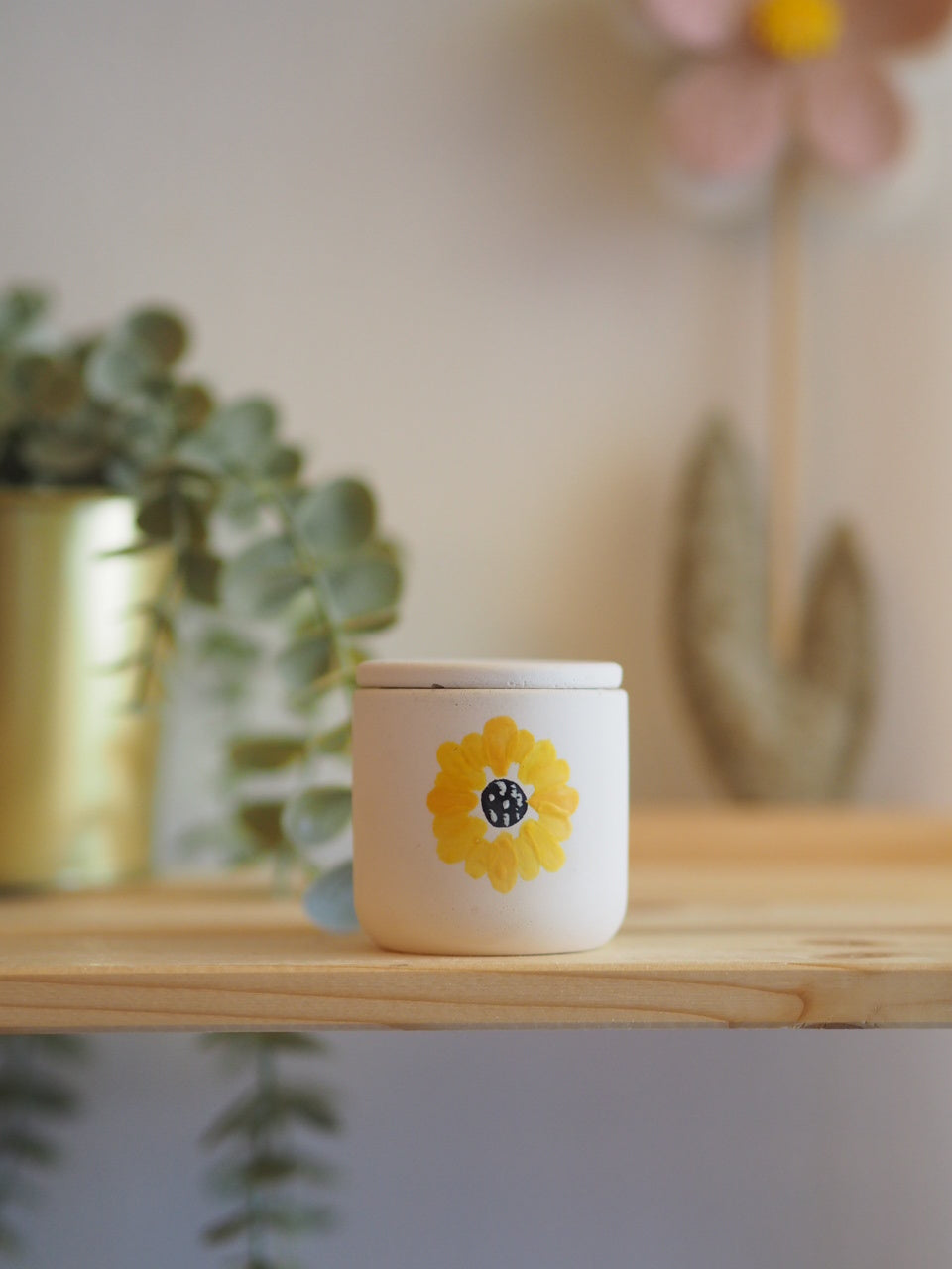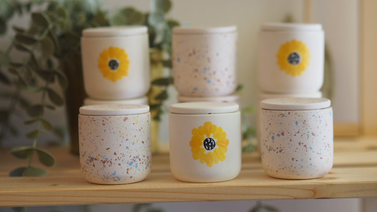 Χειροποίητο τσιμεντένιο δοχείο με ζωγραφιστή στο χέρι μαργαρίτα 🌼Ένα μοναδικό, χειροποίητο τσιμεντένιο δοχείο διακοσμημένο με ζωγραφιστή στο χέρι μαργαρίτα σε φωτεινή κίτρινη απόχρωση. Κάθε κομμάτι δημιουργείται ξεχωριστά, με μικρές φυσικές διαφοροποιήσεις που αναδεικνύουν τον αυθεντικό, artisanal χαρακτήρα του.